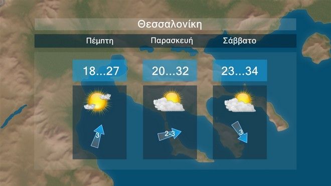 Καιρός: Γενικά αίθριος. Ανεμοι: Από βόρειες διευθύνσεις 3 με 4 μποφόρ. Θερμοκρασία: Από 17 έως 30 βαθμούς Κελσίου.