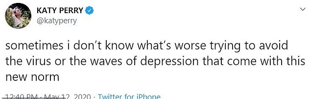 «Μερικές φορές δεν ξέρω τι χειρότερο, το να προσπαθώ να αποφύγω τον ιό ή τα κύματα της κατάθλιψης που έρχονται με αυτόν τον νέο κανόνα», έγραψε στο Twitter της η 35χρονη σταρ την Τρίτη.