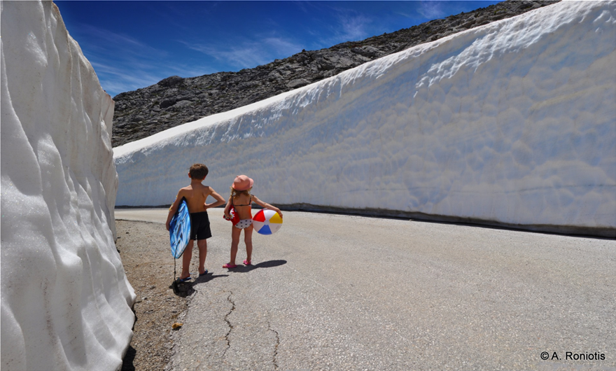 Oπως αναφέρει το Πρώτο Θέμα, ένα αγοράκι και ένα κοριτσάκι, με εξοπλισμό παραλίας, βρίσκονται ανάμεσα στα χιόνια, στον δρόμο για το βουνό του Σκίνακα και αναζητούν την παραλία.