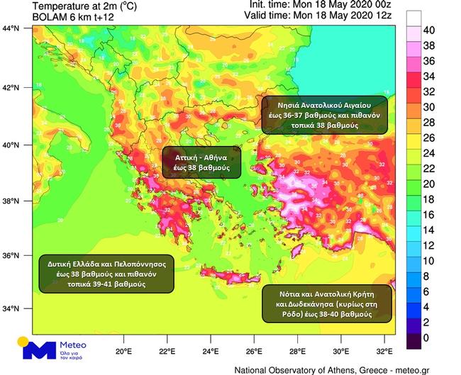 Πολύ υψηλές μέγιστες θερμοκρασίες θα σημειωθούν στη Δυτική και Νότια Ελλάδα (ιδιαίτερα στη Νότια Πελοπόννησο), στην Ανατολική και Νότια Κρήτη, στα Δωδεκάνησα (κυρίως στη Ρόδο) και στην Αττική, όπως φαίνεται στον προγνωστικό χάρτη θερμοκρασιών που ακολουθεί για τις μεσημεριανές ώρες της Δευτέρας.