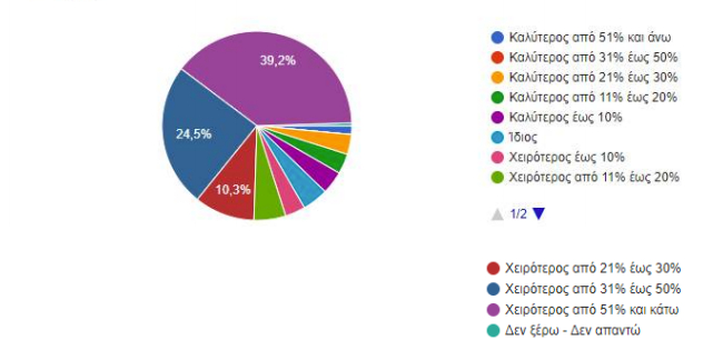 Στη συγκεκριμένη ερώτηση, ένας στους τέσσερις απάντησε ότι είχε πτώση τζίρου πάνω από 50% και συνολικά το 82,8% των καταστημάτων κατέγραψε χειρότερα αποτελέσματα σε σχέση με την αντίστοιχη περυσινή εβδομάδα. Αντίθετα, μόνο το 12,3% δήλωσε πως κατέγραψε αυξητικές τάσεις του τζίρου του.