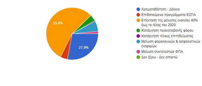 Ειδικότερα, ένας στους δύο κρίνει ως σημαντικότερο παράγοντα βιωσιμότητας της επιχείρησής του, την επέκταση της μείωσης του ενοικίου έως το τέλος του έτους(κάτι που φαίνεται να αποκλείει το κυβερνητικό επιτελείο). Ως δεύτερος σημαντικότερος παράγοντας καταγράφηκε η χρηματοδότηση μέσω δανείων, για την άμεση αύξηση της ρευστότητας των επιχειρήσεων.