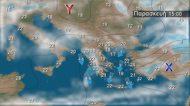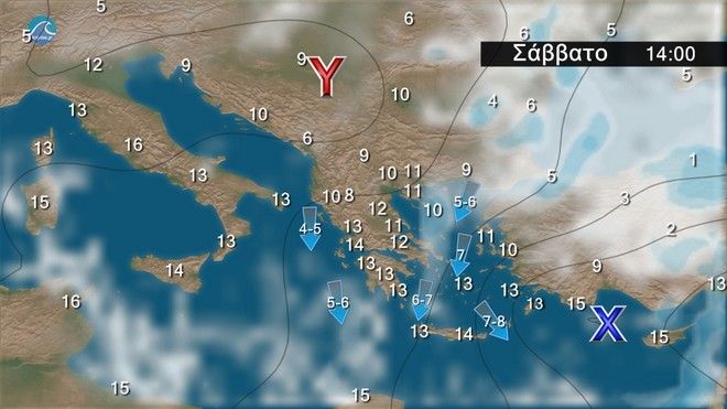 Καιρός: Γενικά αίθριος. Ανεμοι: Μεταβλητοί 3 με 4 μποφόρ και βαθμιαία δυτικοί νοτιοδυτικοί 5 με 6 μποφόρ. Θερμοκρασία: Από 20 έως 30 και στην Κρήτη έως 34 βαθμούς Κελσίου.