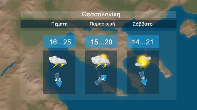 Κατά τη διάρκεια της Πέμπτης ισχυρές βροχές και καταιγίδες θα εκδηλωθούν σε μεγάλο μέρος της ηπειρωτικής χώρας, συμπεριλαμβανομένης της Θεσσαλονίκης, φαινόμενα που μέχρι το βράδυ της Πέμπτης θα επεκταθούν στην Εύβοια, στις Σποράδες και ενδεχομένως στη Βόρεια Αττική.