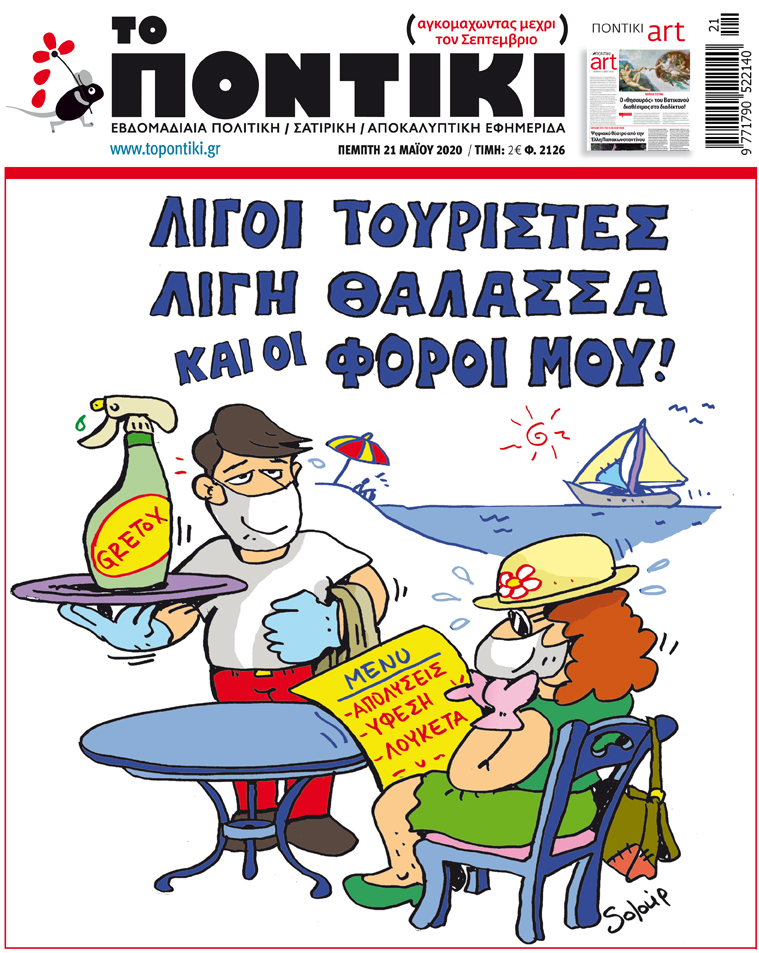 Με πρωτοσέλιδο σκίτσο «Λίγοι τουρίστες, λίγη θάλασσα και οι φόροι μου!» και αναλυτικό-αποκαλυπτικό ρεπορτάζ για το βάθος της ύφεσης και το εύρος των συνεπειών σε οικονομία και εργασία, κυκλοφορεί το «ΠΟΝΤΙΚΙ» το πρωί της Πέμπτης.