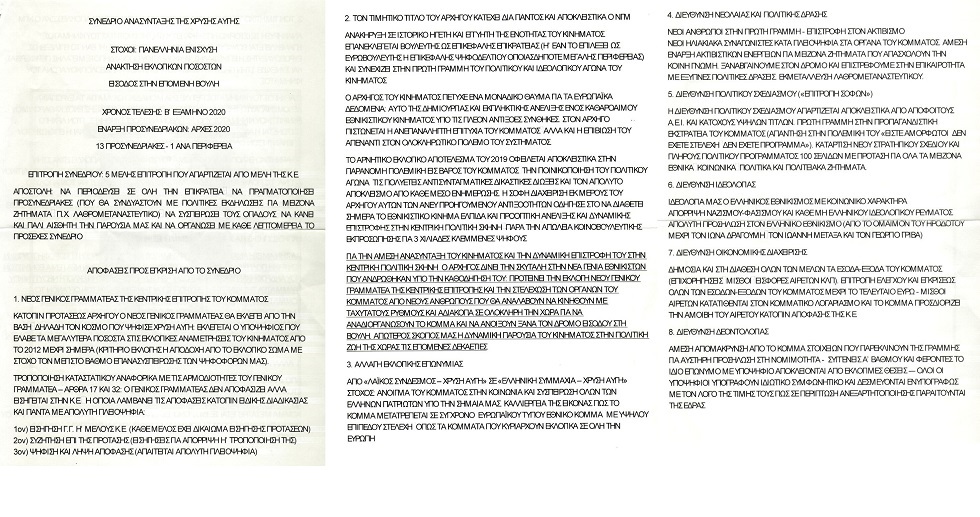 Με αφορμή τη δημοσιοποίηση ενός ντοκουμέντου από τον δημοσιογράφο Δημήτρη Ψαρρά στην «Εφημερίδα των Συντακτών» της επιστολής Κασιδιάρη προς τον Μιχαλολιάκο με την οποίο αξίωνε συνέδριο διαδοχής στο οποίο θα επιλεγόταν ο ίδιος ως πρώτος σε ψήφους και ο Μιχαλολιάκος θα αρκούταν στον ρόλο του επίτιμου “Αρχηγού”, οι δύο πλευρές αλληλοκατηγορούνται για τη διαρροή του εγγράφου.