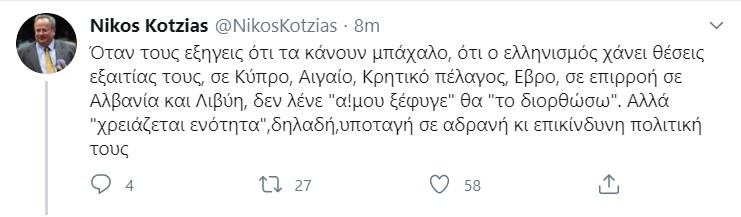 Με ανάρτησή του στο Twitter, o κ. Κοτζιάς σημείωσε δηκτικά ότι «όταν τους εξηγεις ότι τα κάνουν μπάχαλο, ότι ο ελληνισμός χάνει θέσεις εξαιτίας τους, σε Κύπρο, Αιγαίο, Κρητικό πέλαγος, Εβρο, σε επιρροή σε Αλβανία και Λιβύη, δεν λένε “α! μου ξέφυγε” θα “το διορθώσω”. Αλλά “χρειάζεται ενότητα”, δηλαδή, υποταγή σε αδρανή κι επικίνδυνη πολιτική τους».
