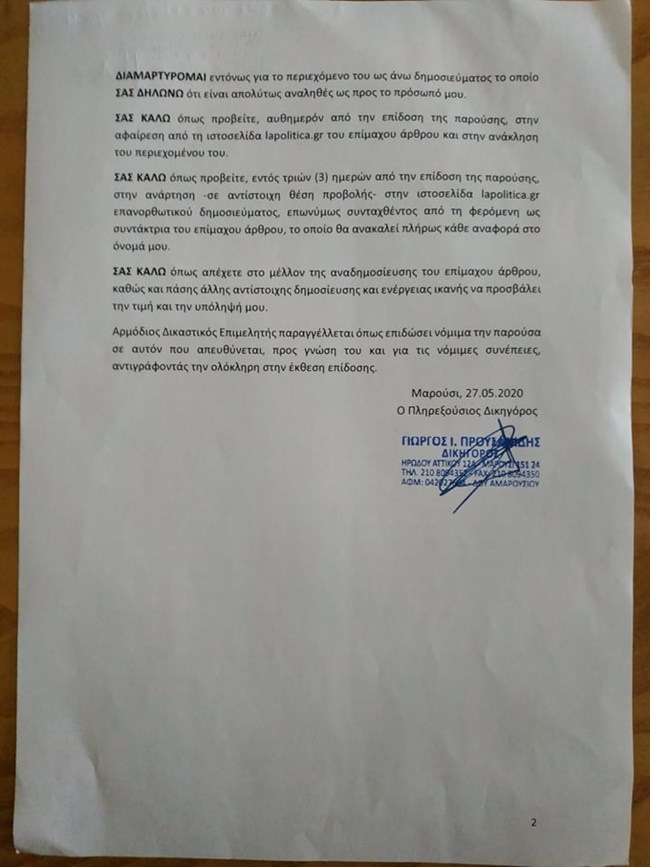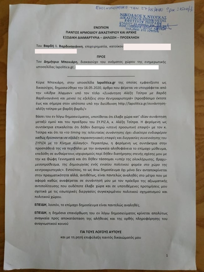 Στο εξώδικο καλεί τον κ. Μπεκιάρη να αποσύρει το άρθρο το οποίο μιλούσε για συνάντηση Βαρδινογιάννη – Τσίπρα σε περίοδο που βρίσκονταν σε εξέλιξη παρασκηνιακές επαφές και διεργασίες συνεννόησης του ΣΥΡΙΖΑ με το Κίνημα Αλλαγής.