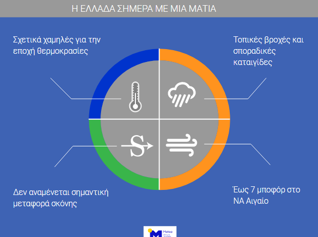 Παραμένει άστατος ο καιρός και σήμερα, σύμφωνα με τα τελευταία προγνωστικά δεδομένα του Εθνικού Αστεροσκοπείου Αθηνών/meteo.gr. Οι ασθενείς τοπικές βροχές που σημειώθηκαν έως το πρωί, κατά κύριο λόγο στο Αιγαίο και στην Κρήτη, θα επεκταθούν σταδιακά στην υπόλοιπη χώρα και θα ενισχυθούν, ενώ κατά τόπους θα εκδηλωθούν και καταιγίδες.