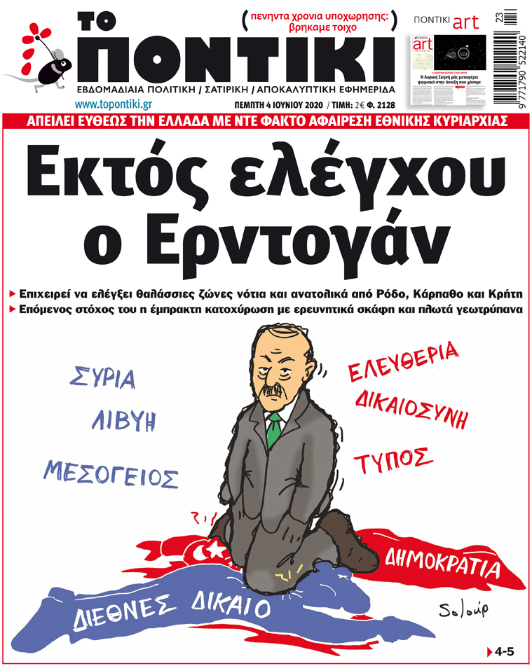 Με πρωτοσέλιδο τίτλο «Εκτός ελέγχου ο Ερντογάν» και αναλυτικό-αποκαλυπτικό ρεπορτάζ για τις ευθείς απειλές της Τουρκίας στην Ελλάδα με ντε φάκτο αφαίρεση της εθνικής κυριαρχίας, κυκλοφορεί το «ΠΟΝΤΙΚΙ» το πρωί της Πέμπτης.