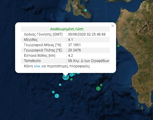 Το επίκεντρο της δόνησης εντοπίζεται στο θαλάσσιο χώρο 57 χιλιόμετρα δυτικά των Στροφάδων.