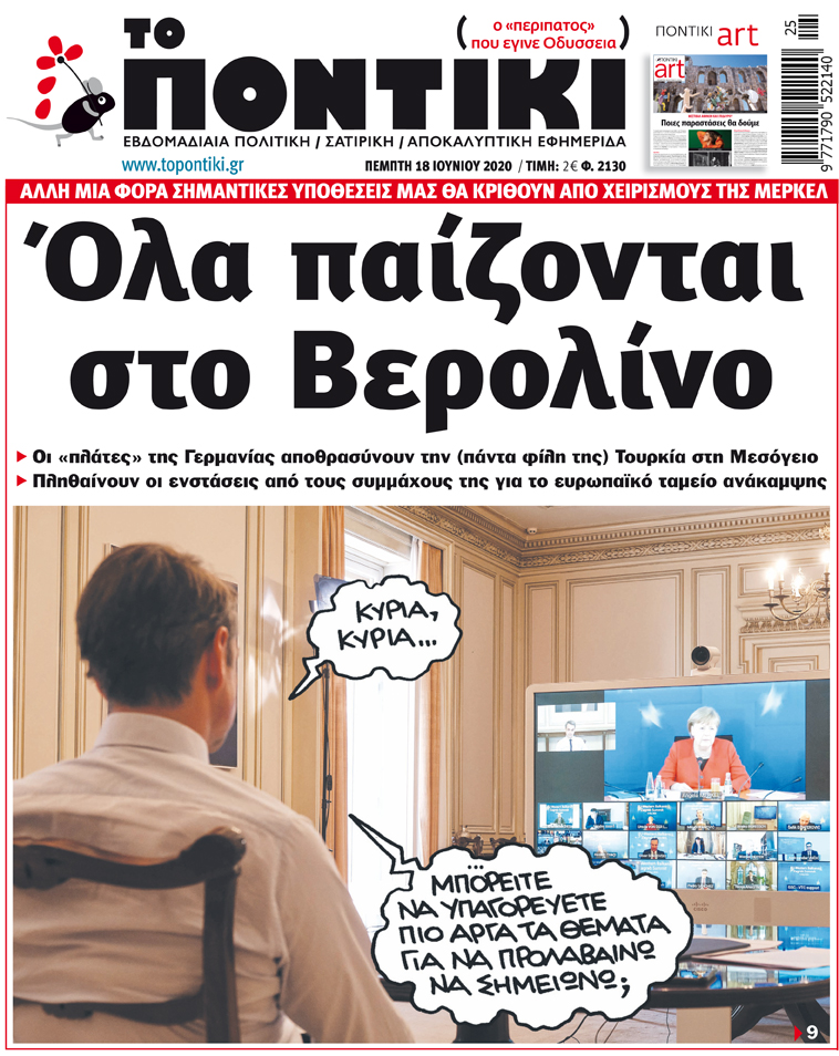 Με πρωτοσέλιδο τίτλο «Όλα παίζονται στο Βερολίνο» και αναλυτικό-αποκαλυπτικό ρεπορτάζ για τις σημαντικές υποθέσεις της Ελλάδας που θα κριθούν για άλλη μια φορά από τους χειρισμούς της Μέρκελ, κυκλοφορεί το «ΠΟΝΤΙΚΙ» το πρωί της Πέμπτης.