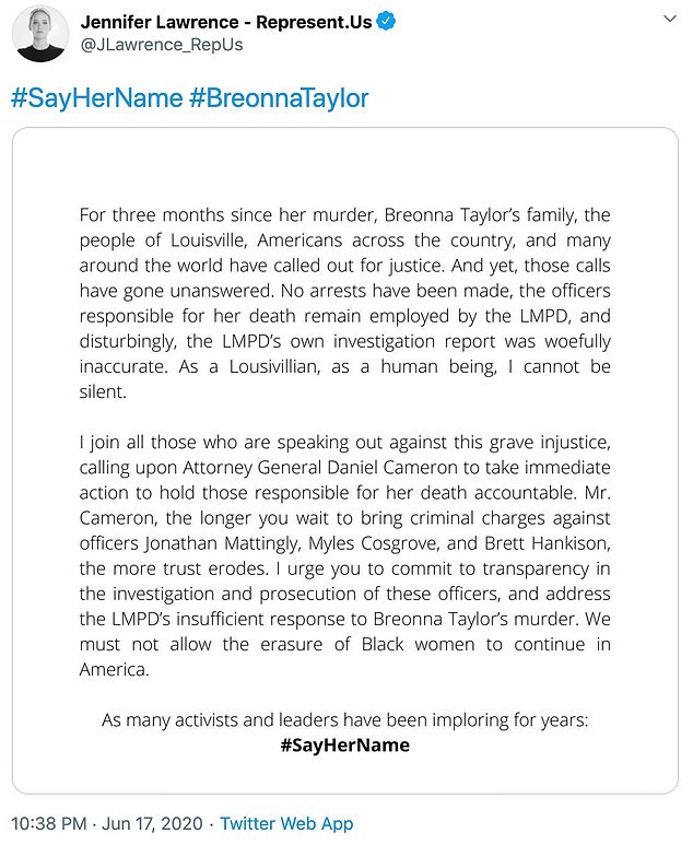Η Jennifer Lawrence, η οποία είναι μέλος του διοικητικού συμβουλίου για το RepresentUs, συνεχίζει να χρησιμοποιεί την πλατφόρμα για καλό σκοπό, καθώς στο πρώτο της tweet εξήγησε πώς ένας στους τέσσερις μαύρους στην Αμερική θα φυλακιστεί κάποια στιγμή στη ζωή του λόγω ενός διεφθαρμένου συστήματος.