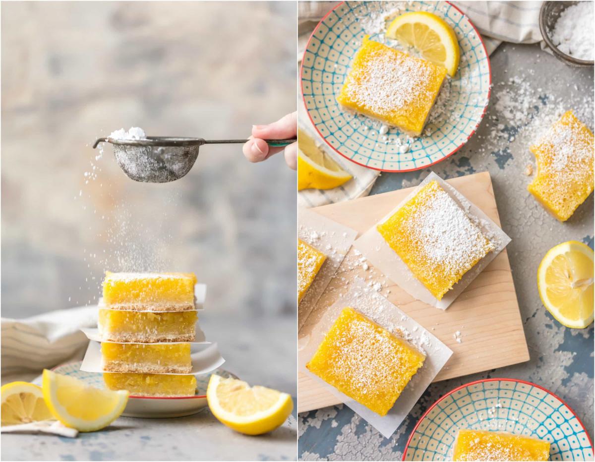 Για τη γέμιση ανακατέψτε τα αυγά, τη ζάχαρη, το ξύσμα, το χυμό και το αλεύρι. Ρίξτε το στη βάση προσεκτικά και ψήστε για 30-35 λεπτά μέχρι να σταθεροποιηθεί η επιφάνεια και να μην «τρέμει» στο κέντρο. Αφήστε να κρυώσει, κόψτε σε μπαράκια ή τετράγωνα κομμάτια και πασπαλίστε με ζάχαρη άχνη. Διατηρείται στο ψυγείο.