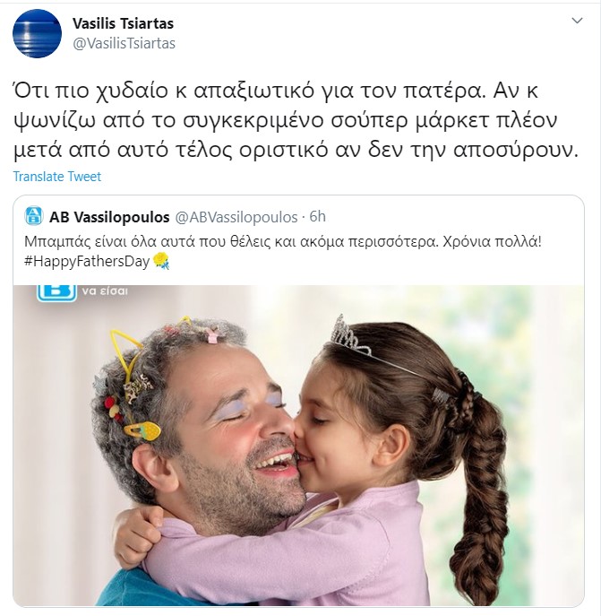 Ωστόσο το ποστ έκανε έξαλλο τον Β. Τσιάρτα, ο οποίος έγραψε στο Twitter: «Ό,τι πιο χυδαίο και απαξιωτικό για τον πατέρα. Αν και ψωνίζω από το συγκεκριμένο σούπερ μάρκετ πλέον μετά από αυτό τέλος οριστικό αν δεν την αποσύρουν».