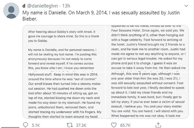 Η χρήστρια του Twitter Danielle ισχυρίστηκε ότι δέχτηκε επίθεση από τον Bieber σε ένα δωμάτιο στο Four Seasons Hotel στο Ώστιν του Τέξας, στις 9 Μαρτίου 2014, μετά από μια εκδήλωση που ήταν μέρος του φεστιβάλ SXSW της πόλης.