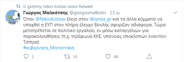 Έτσι, χθες, ο αρχιτέκτονας της «Συμφωνίας των Πρεσπών», με ένα retweet του, έδειξε πως συμφωνεί με την άποψη ότι «όταν ο Νίκος Κοτζιάς έλεγε στον ΣΥΡΙΖΑ και τα άλλα κόμματα να υπαχθεί η ΕΥΠ στον πλήρη έλεγχο Βουλής, σφύριζαν αδιάφορα». «Τώρα μετατρέπεται σε πολιτικό εργαλείο, εν μέσω καταγγελιών για παρακολουθήσεις».