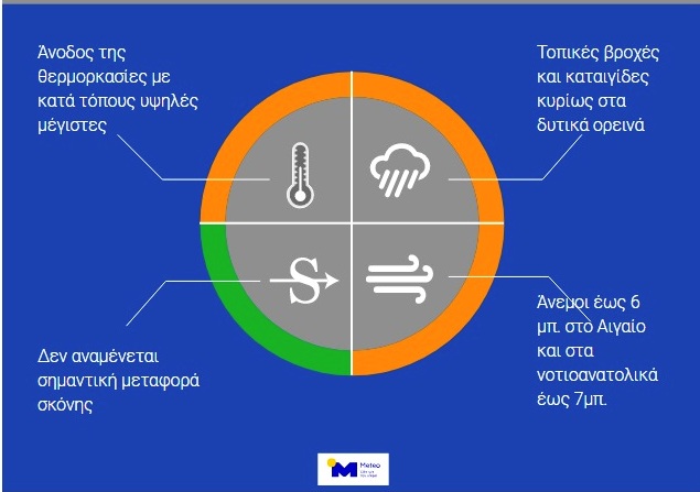 Τις θερμές ωστόσο ώρες της ημέρας στα ηπειρωτικά θα αναπτυχθούν νεφώσεις και θα εκδηλωθούν όμβροι και σποραδικές καταιγίδες στα ορεινά της Δυτικής Ελλάδας και της Πελοποννήσου.