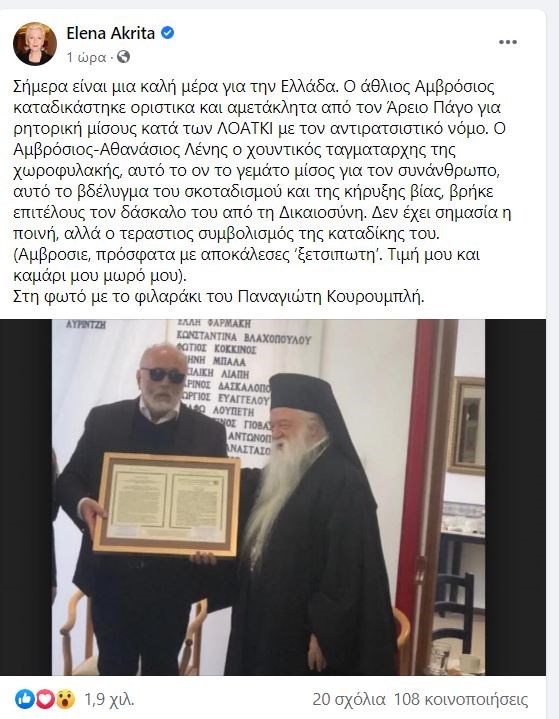 Η Έλενα Ακρίτα με ανάρτησή της στην προσωπική της σελίδα στο Facebook εξέφρασε την ικανοποίησή της για την καταδίκη του πρώην Μητροπολίτη Αμβρόσιου από τον Άρειο Πάγο.