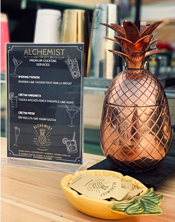 Το φορητό μπαρ λέγεται Alchemist και είναι ένα πλήρως εξοπλισμένο μπαρ που μπορεί να πάει παντού και να υποστηρίξει οποιοδήποτε event, κοινωνικό ή επαγγελματικό σε κάθε μέρος της Ελλάδας, κάνοντας αλχημείες με αρωματικά και φρουτώδη cocktails, αναδεικνύοντας πάντα τις Κρητικές επιρροές!