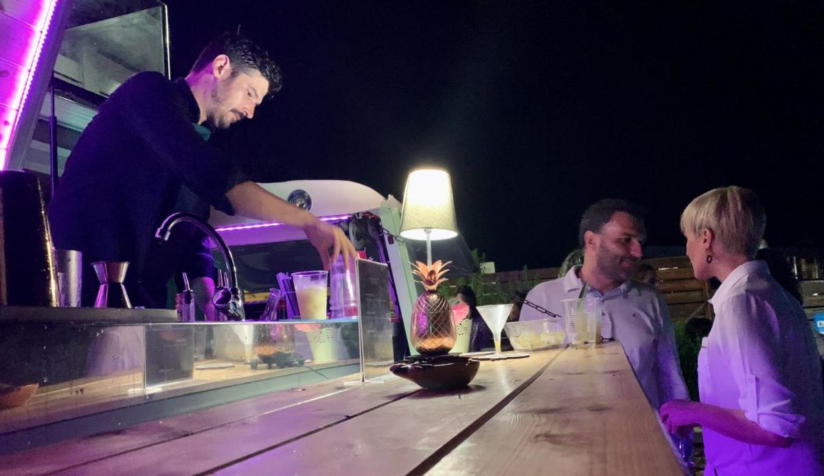 Όπως ήταν φυσικό, οι καλεσμένοι εντυπωσιασμένοι από την όψη του βαν (ένα Ford Transit του 1950) απόλαυσαν το ποτό τους αλλά και τα μοναδικά κοκτέιλ που φτιάχνει ο ταλαντούχος bartender, ο οποίος έχει εμπνευστεί από τα κρητικά βότανα!