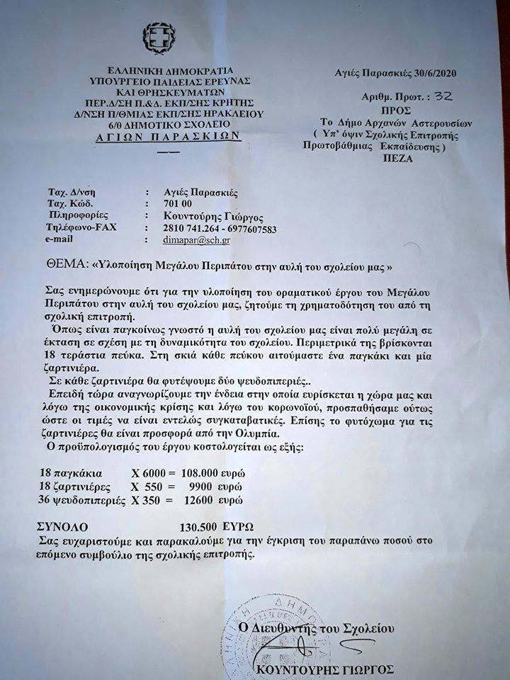 Με επιστολή της η διεύθυνση του 6ου Δημοτικού Σχολείου στις Αγιές Παρασκιές προς το Δήμο Αχαρνών Αστερουσίων στο Ηράκλειο Κρήτης στις 30 Ιουνίου ζητά την έγκριση κονδυλίου… 130.500 ευρώ για την υλοποίηση… Μεγάλου Περιπάτου στην αυλή του.