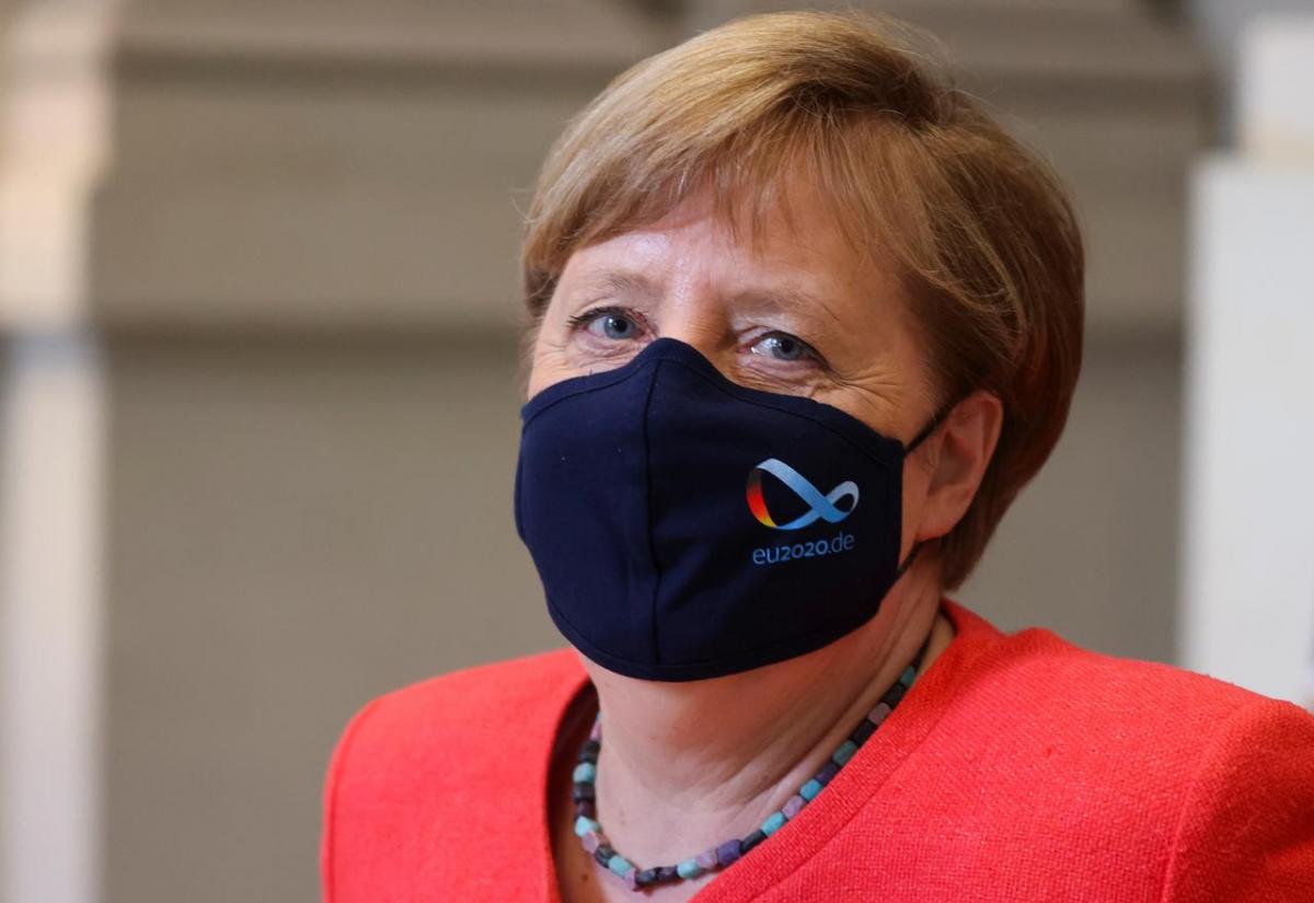 Η Μέρκελ μπήκε στην Μπούντεσρατ, την άνω βουλή του γερμανικού κοινοβουλίου, φορώντας μια μαύρη μάσκα με το σήμα EU2020.de του ιστότοπου που είναι αφιερωμένος στην εξάμηνη προεδρία της ΕΕ από την Γερμανία από την 1η Ιουλίου.