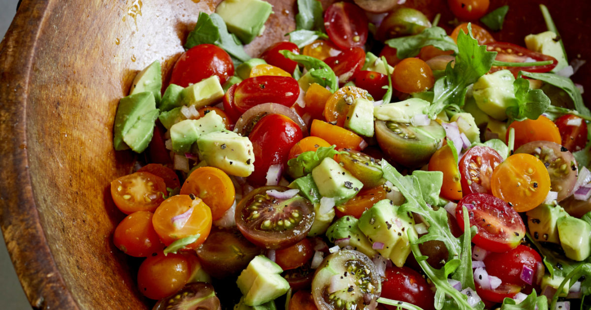 Σε ένα μεγάλο μπολ σαλάτας, βάλτε τα ντοματίνια, τον καρπό καλαμποκιού, το αβοκάντο σε φέτες, το κόκκινο κρεμμύδι σε φέτες, το 1/4 φλιτζάνι ψιλοκομμένο κόλιαντρο και τις πολτοποιημένες σκελίδες σκόρδο.