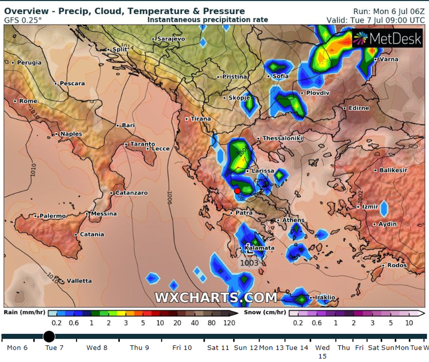 Πιο αναλυτικά, την Τρίτη βροχές και καταιγίδες θα εκδηλωθούν τις πρωινές ώρες σε περιοχές της Θεσσαλίας, της Στερεάς, της Κεντρικής Μακεδονίας και στις Σποράδες. Τα φαινόμενα, που τοπικά θα είναι έντονα και σε ορισμένες περιπτώσεις θα συνοδεύονται από χαλαζοπτώσεις, τις μεσημεριανές ώρες θα επηρεάσουν το μεγαλύτερο μέρος της ηπειρωτικής χώρας, τα νησιά του Ανατολικού Αιγαίου και την Κρήτη.