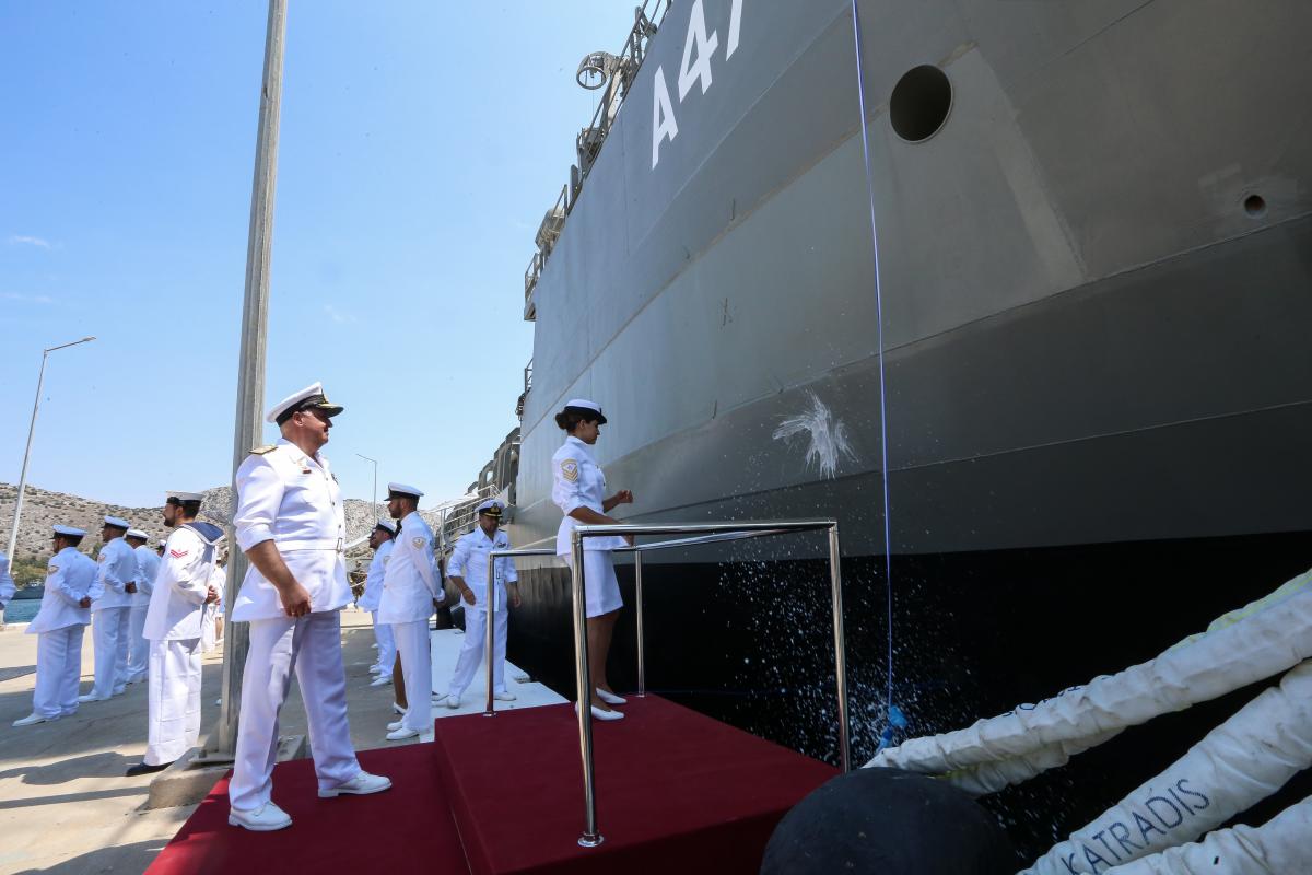 Όπως φαίνεται καθαρά μία γυναίκα στέλεχος του ΠΝ πέταξε το καθιερωμένο μπουκάλι με σαμπάνια στο κύτος του πλοίου (κάπως αδέξια ομολογουμένως) και αυτό δεν έσπασε όπως θα έπρεπε, αλλά αναπήδησε.