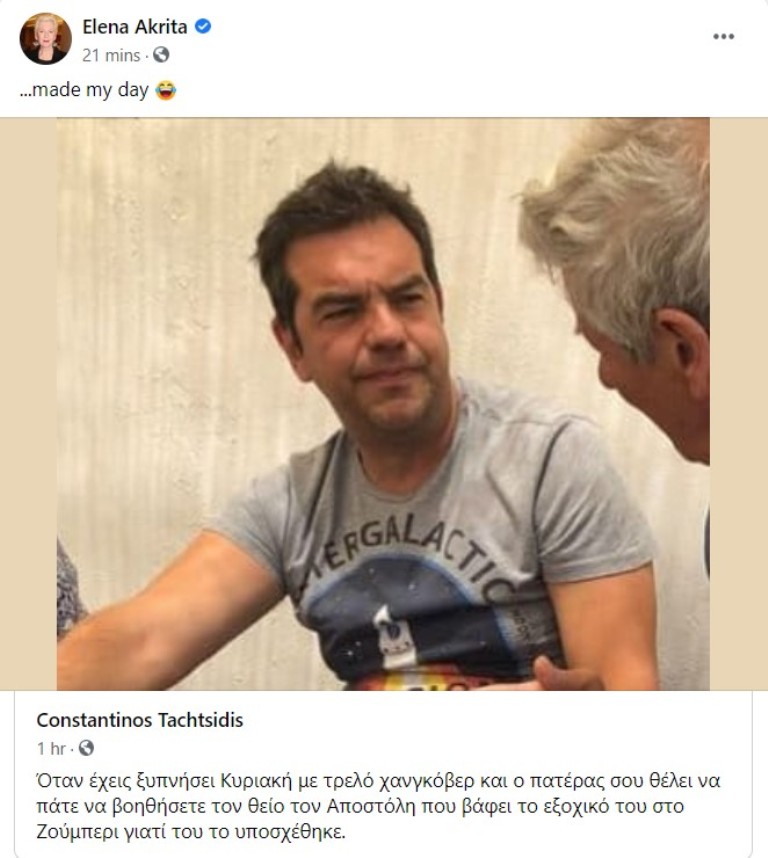 Έτσι, με αφορμή ανάρτηση δημοσιογράφου ο οποίος σχολίασε σκωπτικά φωτογραφία του Αλέξη Τσίπρα («Όταν έχεις ξυπνήσει Κυριακή με τρελό χανγκόβερ και ο πατέρας σου θέλει να πάτε να βοηθήσετε τον θείο τον Αποστόλη που βάφει το εξοχικό του στο Ζούμπερι γιατί του το υποσχέθηκε»), η Έλενα Ακρίτα έγραψε «…made my day», ελληνιστί «μού’ φτιαξε τη μέρα».