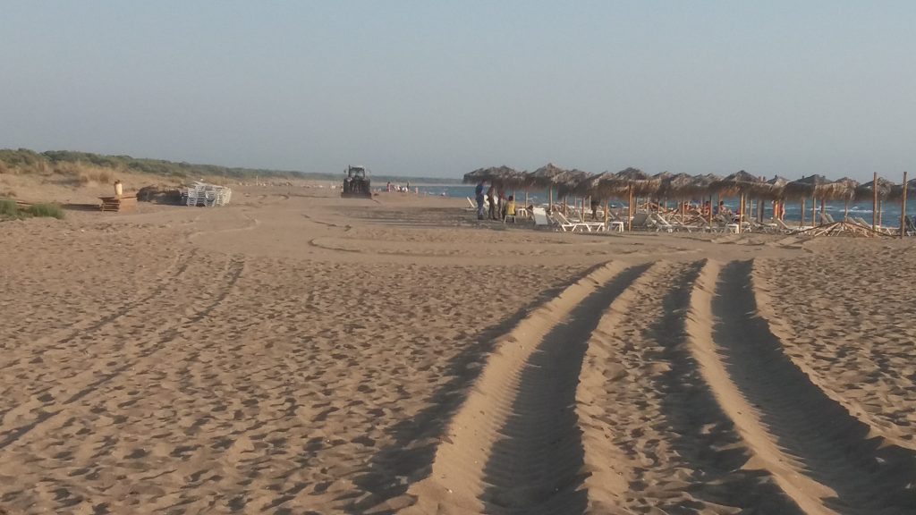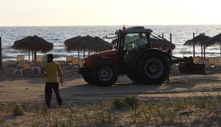 Το τρακτέρ, σύροντας ειδικό “καταστροφέα”, ισοπέδωνε την άμμο στην ζώνη των χαμηλών αμμολόφων και της αμμώδους παραλίας, πάνω και γύρω από τον χώρο των ομπρελών.