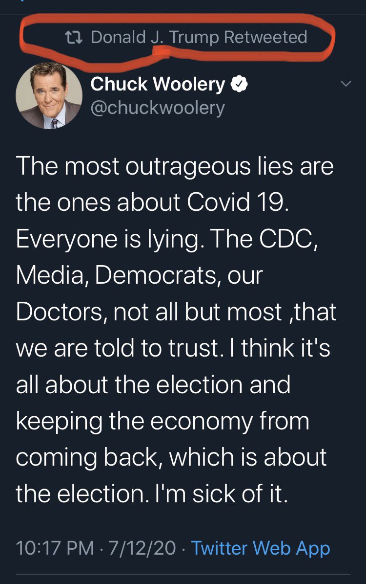 Νωρίτερα αυτήν την εβδομάδα, ο Ντόναλντ Τραμπ μοιράστηκε ένα tweet από τον πρώην οικοδεσπότη του τηλεοπτικού σόου “Love Connection”, Chuck Woolery, ο οποίος κατηγόρησε μέσα μαζικής ενημέρωσης, δημοκράτες και γιατρούς, υποστηρίζοντας ότι ψεύδονται για τον κορονοϊό.