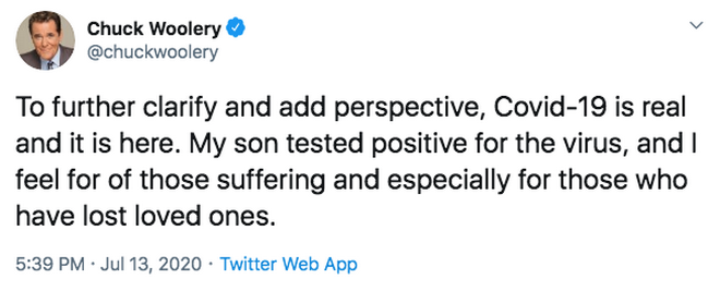 Ωστόσο, μόλις 24 ώρες αργότερα, ο Woolery αναγκάστηκε να πάρει πίσω τα σχόλια αφού ο γιος του βρέθηκε θετικός στον ιό, όπως γράφει το consequenceofsound. “Ο γιος μου έχει βρεθεί θετικός στον ιό και συμπάσχω με εκείνους που υποφέρουν και ειδικά με εκείνους που έχουν χάσει τους αγαπημένους τους”, έγραψε ο πρώην παρουσιαστής σε tweet που δημοσιεύτηκε τη Δευτέρα το απόγευμα. Λίγο αργότερα, ο ίδιος απενεργοποίησε εντελώς τον λογαριασμό του στο Twitter.