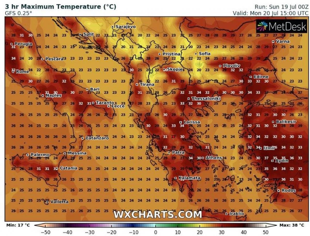 Θερμοκρασία: Από 18 έως 33 βαθμούς Κελσίου. Στη δυτική Μακεδονία κατά τόπους 3 με 4 βαθμούς χαμηλότερη.