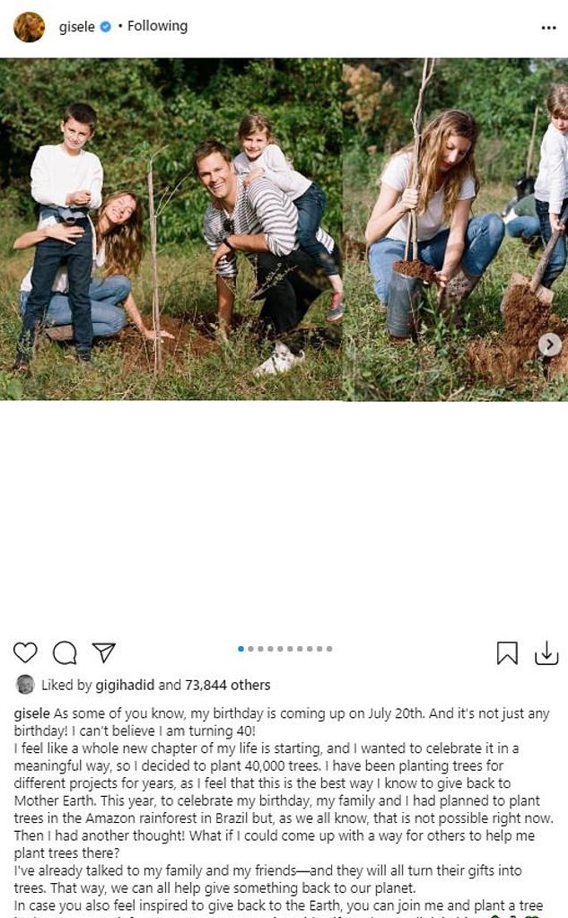 «Χρόνια πολλά για τα 40α γενέθλια @gisele “Είσαι η ηλιαχτίδα της ζωής μου” Γι ‘αυτό θα είμαι πάντα γύρω. Είσαι το μήλο του ματιού μου. Για πάντα θα μείνεις στην καρδιά μου» έγραψε, χρησιμοποιώντας στίχους από το τραγούδι του 1972 του Stevie Wonder.