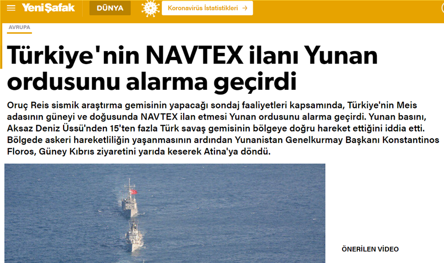 «Η τουρκική ΝΑVTEX ανησύχησε τον Ελληνικό Στρατό» γράφει η φιλοκυβερνητική Yeni Safak, υποστηρίζοντας πως το «το εύρος των δραστηριοτήτων που θα κάνει το σεισμικό ερευνητικό σκάφος Oruc Reis, στη Ν και ΝΑ Μεσόγειο με έκδοση NAVTEX ανησυχεί την Ελλάδα»