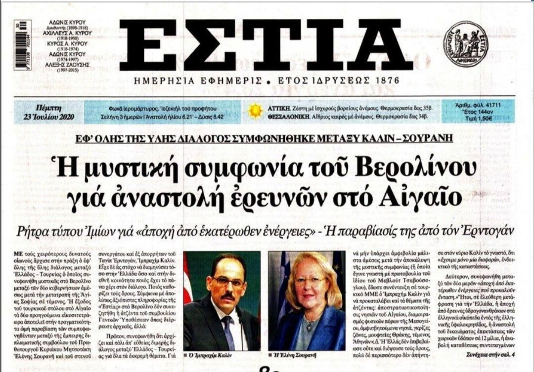 Όπως αναφέρει η εφημερίδα στην μυστική συνάντηση του Βερολίνου (μεταξύ της διπλωματικής συμβούλου του Έλληνα πρωθυπουργού Κυριάκου Μητσοτάκη, Ελένης Σουρανή και του στενού συνεργάτη και απορρήτων του Τούρκου Προέδρου Ρετζέπ Ταγίπ Ερντογάν, Ιμπραχίμ Καλίν) η οποία διέρρευσε από την Τουρκία και τον Τούρκο υπουργό Εξωτερικών Μεβλέτ Τσαβούσογλου, συμφωνήθηκε διάλογος εφ’ όλης της ύλης μεταξύ Τουρκίας και Ελλάδας για όλα τα εκκρεμή θέματα.
