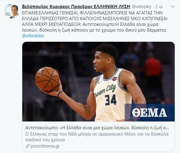 Απαράδεκτη επίθεση κατά του Γιάννη Αντετοκούνμπο εξαπέλυσε μέσω Twitter, ο πρόεδρος της Ελληνικής Λύσης, Κυριάκος Βελόπουλος. Μάλιστα αναφέρθηκε στο «επιχείρημα» της Χρυσής Αυγής, «Έλληνας γεννιέσαι, δεν γίνεσαι».