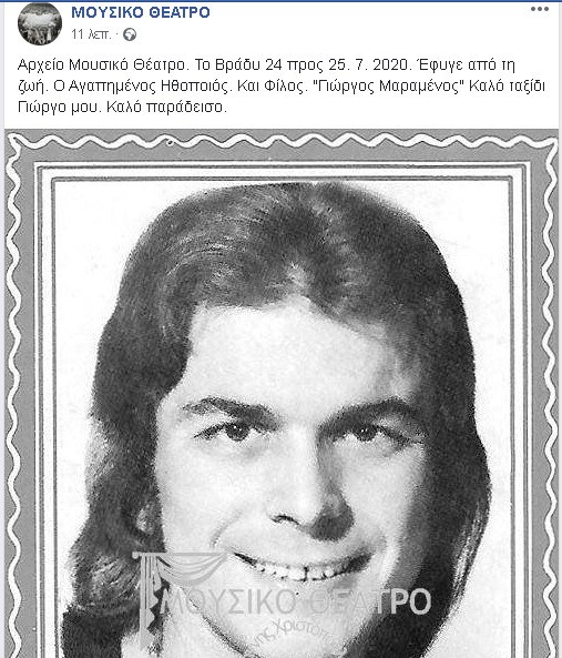 «Αρχείο Μουσικό Θέατρο. Το Βράδυ 24 προς 25. 7. 2020. Έφυγε από τη ζωή. Ο Αγαπημένος Ηθοποιός. Και Φίλος. “Γιώργος Μαραμένος” Καλό ταξίδι Γιώργο μου. Καλό παράδεισο», γράφτηκε στο Facebook για τον εκλιπόντα.