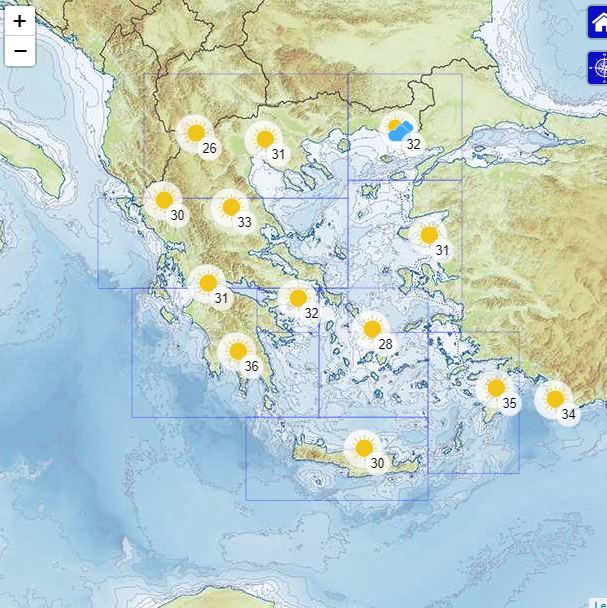Θερμοκρασία: Από 19 έως 37 βαθμούς Κελσίου. Στη δυτική Μακεδονία 2 με 3 βαθμούς χαμηλότερη.