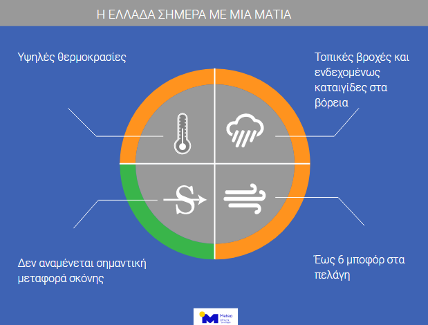 Στη Μακεδονία και πιθανώς στα ορεινά της Θράκης και της Θεσσαλίας θα εκδηλωθούν τοπικές βροχές, ενώ οι άνεμοι θα πνέουν πρόσκαιρα στο Ιόνιο από βόρειες διευθύνσεις 3 με 5 και βαθμιαία στο Αιγαίο 6 μποφόρ.