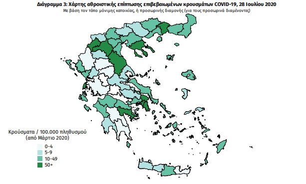 Σύμφωνα με τις υποδείξεις του EVA από την 1η έως τις 26 Ιουλίου διεξήχθησαν συνολικά στα σημεία εισόδου της χώρας 171.138 έλεγχοι σε σύνολο 1.294.798 εισερχομένων στη χώρα και τα επιβεβαιωμένα κρούσματα είναι 344. Από αυτά 70 είναι ακόμα ενεργά, 213 έχουν επιστρέψει στη χώρα προέλευσης και 61 είναι πλέον μη ενεργά και παραμένουν στη χώρα μας. Όσον αφορά την προέλευση των κρουσμάτων τις 4 από τις 5 πρώτες θέσεις εξακολουθούν να καταλαμβάνουν φίλες χώρες της Βαλκανικής Χερσονήσου.