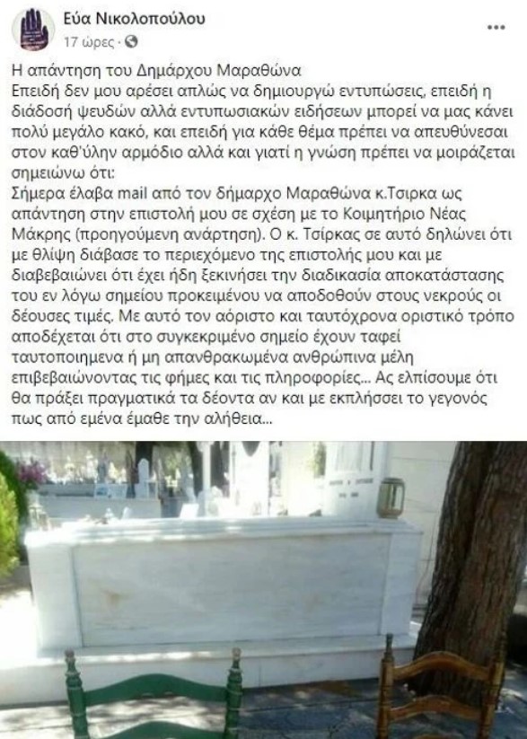 Σε άλλη ανάρτησή της η κ. Νικολοπούλου υποστηρίζει ότι ο Δήμαρχος Μαραθώνα κ. Στέργιος Τσίρκας της απέστειλε email ως απάντηση στην επιστολή της στην οποία τη διαβεβαιώνει ότι έχει ήδη ξεκινήσει την διαδικασία αποκατάστασης του εν λόγω σημείου προκειμένου να αποδοθούν στους νεκρούς οι δέουσες τιμές.