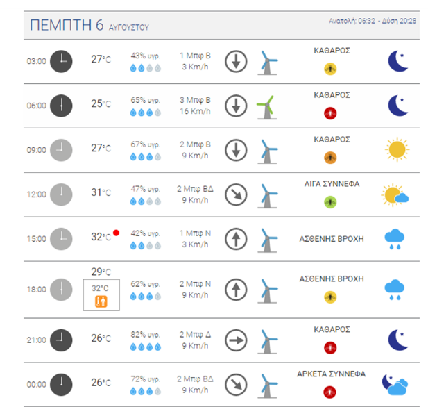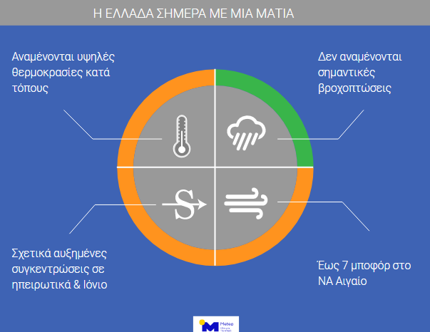 Οι άνεμοι θα πνέουν από βόρειες διευθύνσεις έως 3 και τοπικά στα ανατολικά μέχρι το μεσημέρι έως 4 μποφόρ, ενώ η θερμοκρασία στο κέντρο των Αθηνών θα κυμανθεί από 25 έως 34 βαθμούς.