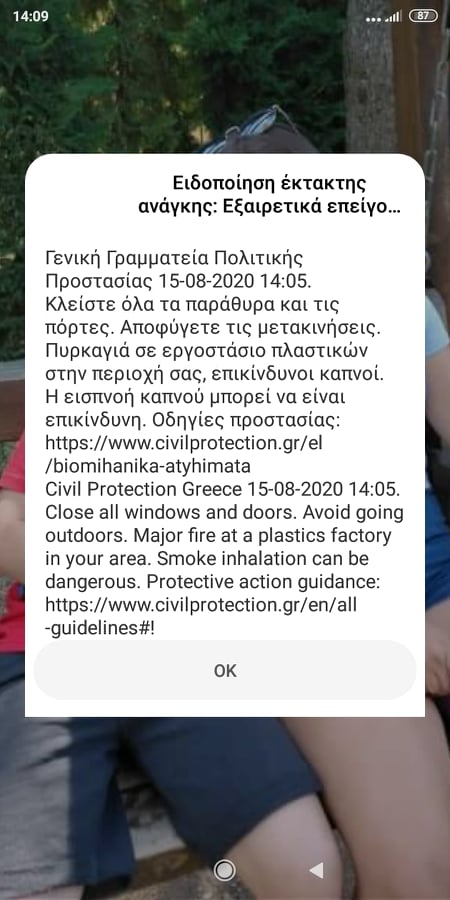 «Κλείστε όλα τα παράθυρα και τις πόρτες. Αποφύγετε τις μετακινήσεις. Πυρκαγιά σε εργοστάσιο πλαστικών στην περιοχή σας, επικίνδυνοι καπνοί. Η εισπνοή καπνού μπορεί να είναι επικίνδυνη», αναφέρει το μήνυμα που έλαβαν.