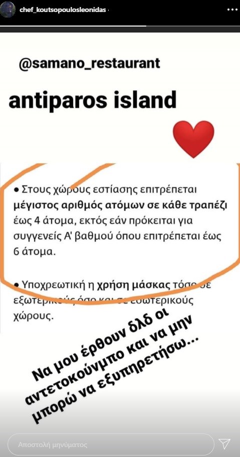 Σε μια χιουμοριστική ανάρτησή του στο Instagram, o Λεωνίδας Κουτσόπουλος δημοσίευσε μια φωτογραφία που αναφέρει το μέτρο με τον περιορισμό των ατόμων στους χώρους εστίασης, δηλαδή 4 άτομα σε κάθε τραπέζι, εκτός αν είναι συγγενείς πρώτου βαθμού όπου επιτρέπεται μέχρι 6 άτομα.
