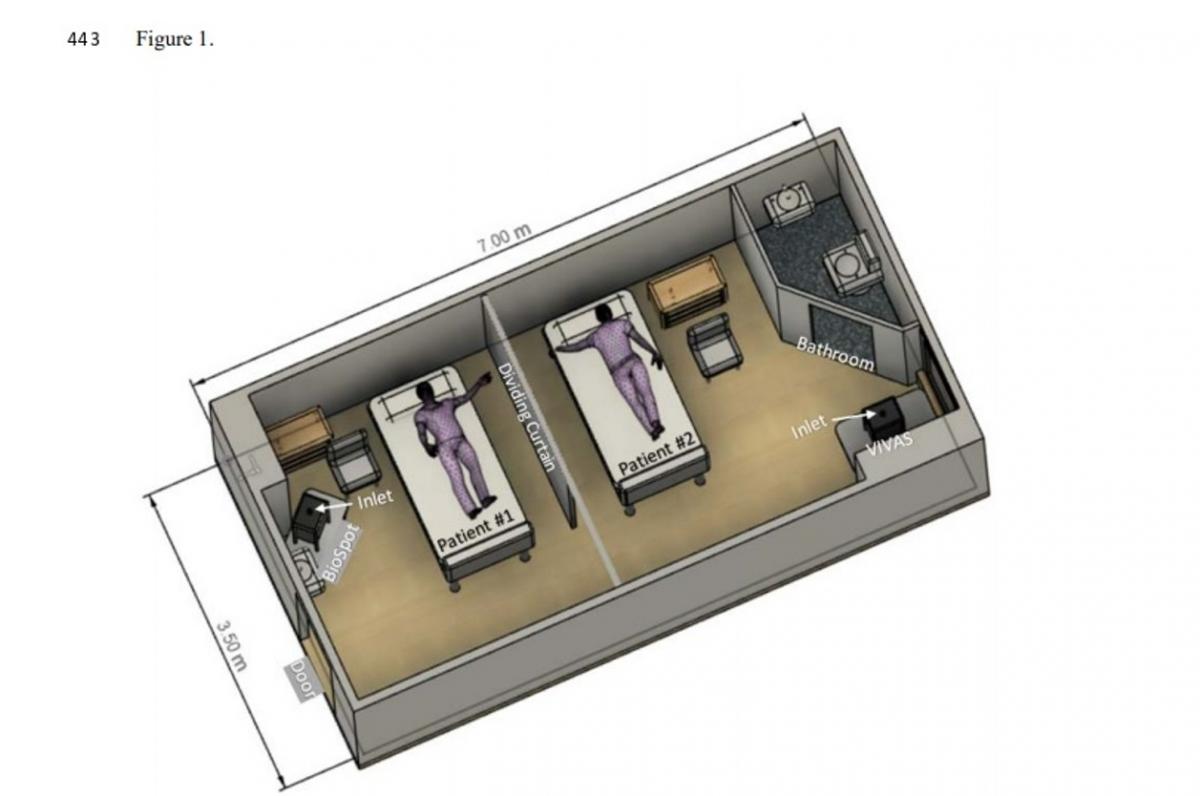 Η νέα μελέτη πραγματοποιήθηκε στο Νοσοκομείο Shands του Πανεπιστημίου της Φλόριντα. Ο ένας από τους δύο νοσηλευόμενους ασθενείς είχε ενεργό λοίμωξη και ανιχνεύσιμο ιό στις μοριακές εξετάσεις. Όπως εξηγούν οι ερευνητές στο άρθρο τους, οι δύο ασθενείς νοσηλεύονταν στον ίδιο θάλαμο. Ανάμεσά τους υπήρχε διαχωριστικό, όπως φαίνεται και στο σκίτσο που παραθέτουν.