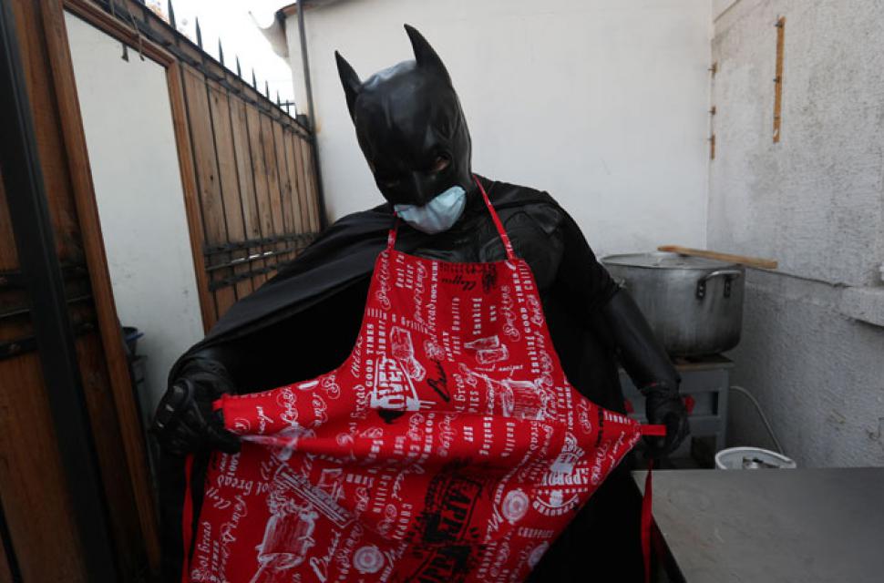 Ο άνδρας, που φοράει μια γυαλιστερή στολή του Μπάτμαν, την οποία συμπληρώνει με μια μάσκα κατά του νέου κορονοϊού, μοιράζει τακτικά μερίδες με ζεστό φαγητό σε άστεγους ανθρώπους σε κάθε γωνιά του Σαντιάγο.