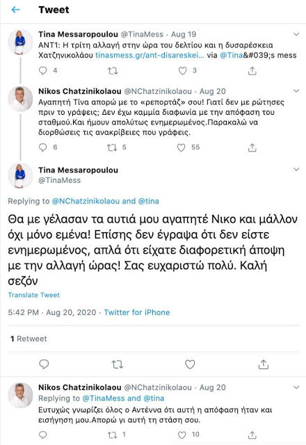 Μόλις ο Νίκος Χατζηνικολάου διάβασε τη σχετική ανάρτηση στο Twitter, ξεκαθάρισε: «Αγαπητή Τίνα απορώ με το «ρεπορτάζ» σου! Γιατί δεν με ρώτησες πριν το γράψεις; Δεν έχω καμμία διαφωνία με την απόφαση του σταθμού. Και ήμουν απολύτως ενημερωμένος. Παρακαλώ να διορθώσεις τις ανακρίβειες που γράφεις».